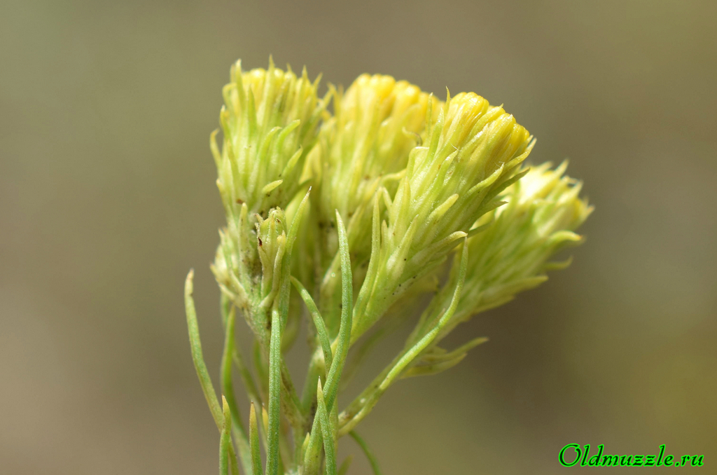 - наружные листочки обёртки линейные или линейно-ланцетные, равны или лишь немного короче внутренних листочков обёртки, острые, обычно отогнутые или отклонённые наружу; все цветки трубчатые, жёлтые, язычковые цветки всегда отсутствуют; листья узколинейные, 1-3 мм шириной, 3-5 см длиной; Многолетник 25-50 см высотой.