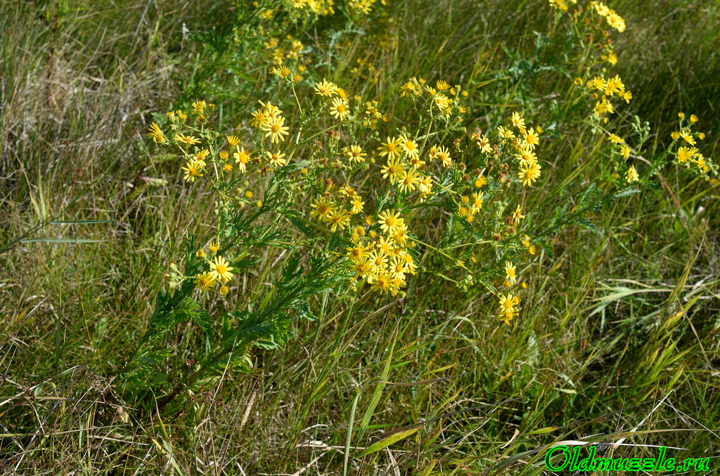 Я наметил себе цель - здоровую кучу кустарника - и направился в ту сторону. Там заманчиво покачивались разноцветные пятна цветков. Первым встретился Крестовник эруколистный, который теперь уже не является краснокнижным растением.