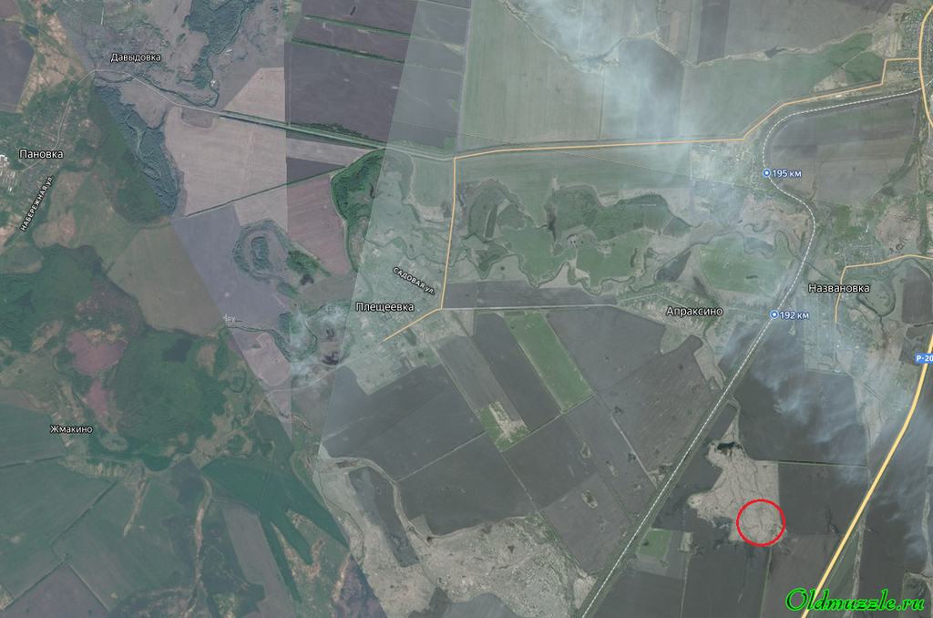 Место наших исследований отмечено на карте красным кружком. Выше к северу находится Апраксино, слева на западе - Жмакино, а в правом верхнем углу виднеется кусочек Колышлея, он весь на карту не поместился. Почти по центру, справа налево через Названовку, Апраксино, Плещеевку и Жмакино тянется река Колышлей, которая далее впадает в Хопёр. Апраксинский солонец тоже находится на каком-то ручье, скорее всего пересыхающем, который впадает в реку Колышлей.